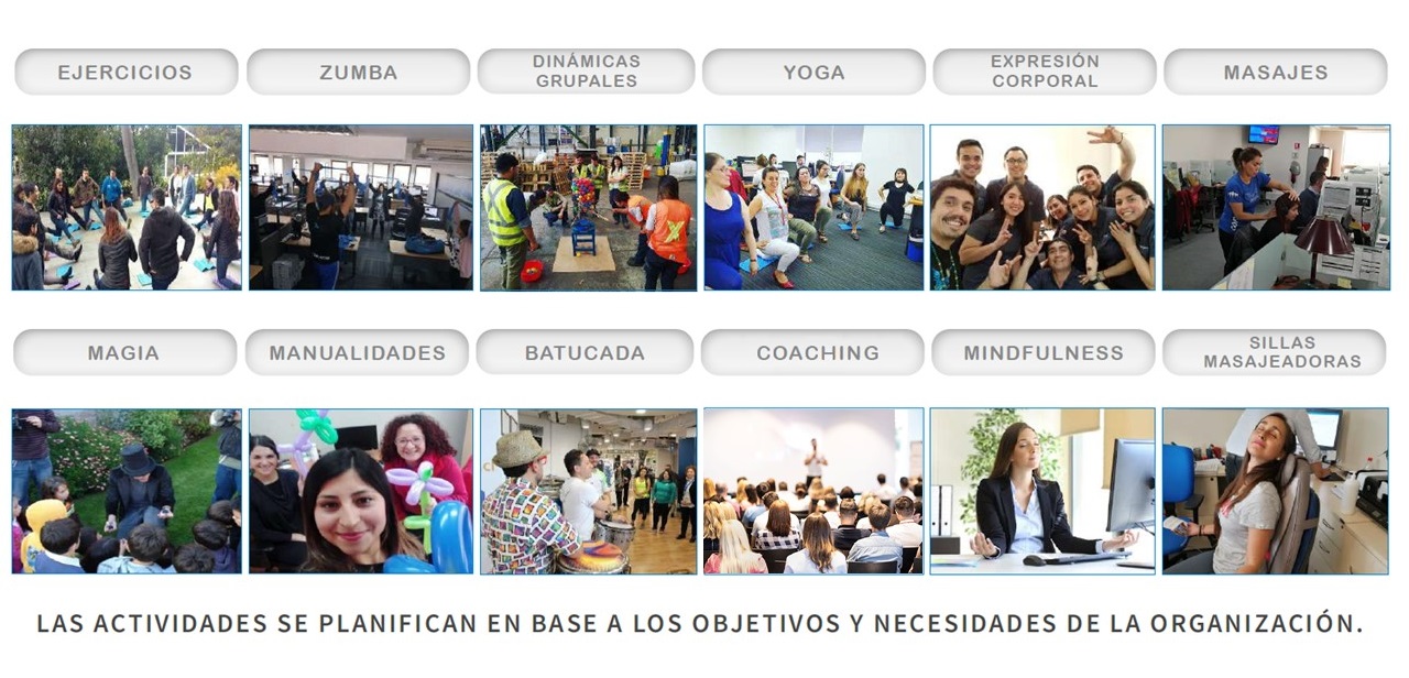 Las pausas activas son intervenciones prácticas relacionadas con el bienestar físico, mental y emocional, que se llevan a cabo durante la jornada de trabajo, las que funcionan por tramos de tiempo (15 -20 -30 min) para cada grupo conformado según la necesidad del cliente y el objetivo de las actividades.